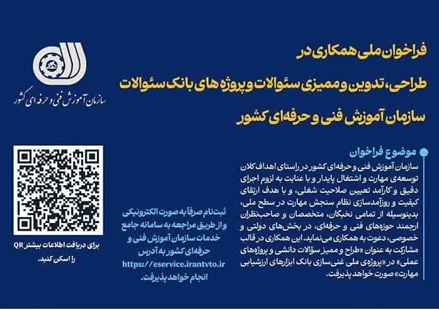سازمان آموزش فنی و حرفه‌ای کشور در راستای اهداف کلان توسعه‌ی مهارت و اشتغال پایدار و با عنایت به لزوم اجرای دقیق و کارآمد تعیین صلاحیت شغلی، و با هدف ارتقای کیفیت و روزآمدسازی نظام سنجش مهارت در سطح ملی، بدینوسیله از تمامی نخبگان، متخصصان و صاحب‌نظران ارجمند حوزه‌های فنی و حرفه‌ای، در بخش‌های دولتی و خصوصی، دعوت به همکاری می‌نماید. این همکاری در قالب مشارکت به عنوان “طراح و ممیز سؤالات دانشی و پروژه‌های عملی” در “پروژه‌ی ملی غنی‌سازی بانک ابزارهای ارزشیابی مهارت” صورت خواهد پذیرفت.